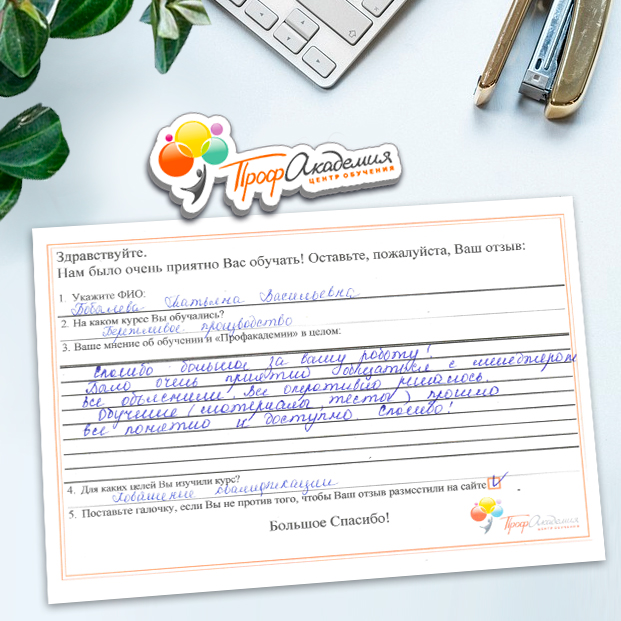 Спасибо большое за вашу работу! Было очень приятно общаться с менеджером, все объяснили. Все оперативно решалось. Обучение (материалы, тесты) прошло, все понятно и доступно. Спасибо!